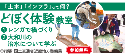 数多くの道路や橋、治水などのインフラ整備を行った行基さんにちなみ、レンガと土砂でつくるアーチ橋づくりや流域治水について学べる装置、奈良筆と奈良墨を使って文字や絵をかく、木簡体験を用いて、