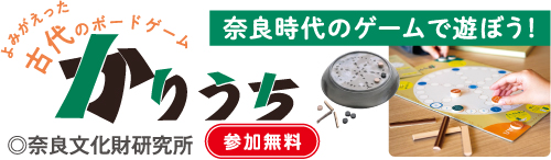 「かりうち」とは、奈良時代の平城宮・京で遊ばれていた双六に似たボードゲームです。奈良文化財研究所では、失われた奈良時代のボードゲームを発掘調査で出土した遺物などをもとに復元し、現代のゲームとしてよみがえらせました。
